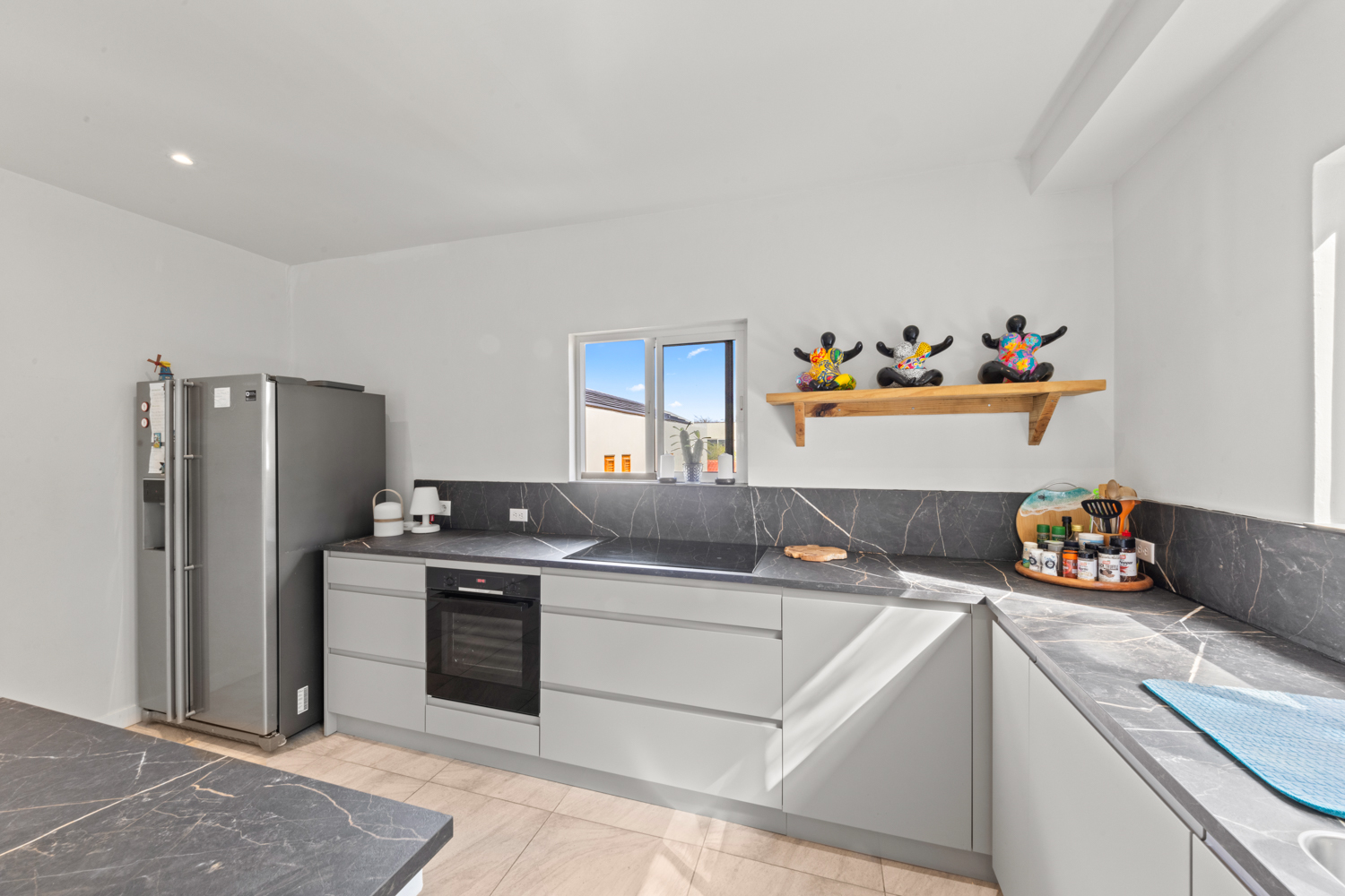 The bright living room forms the heart of the house and radiates a warm, inviting atmosphere. Large windows and French doors provide plenty of natural light and create a seamless connection to the outdoor space. The open kitchen is fully equipped with all necessities, making it easy to prepare meals and together to enjoy a meal – both indoors and outdoors.
