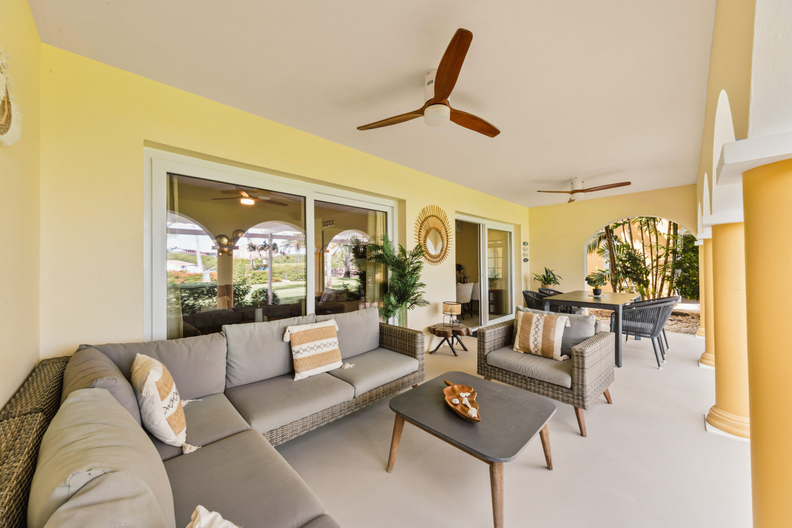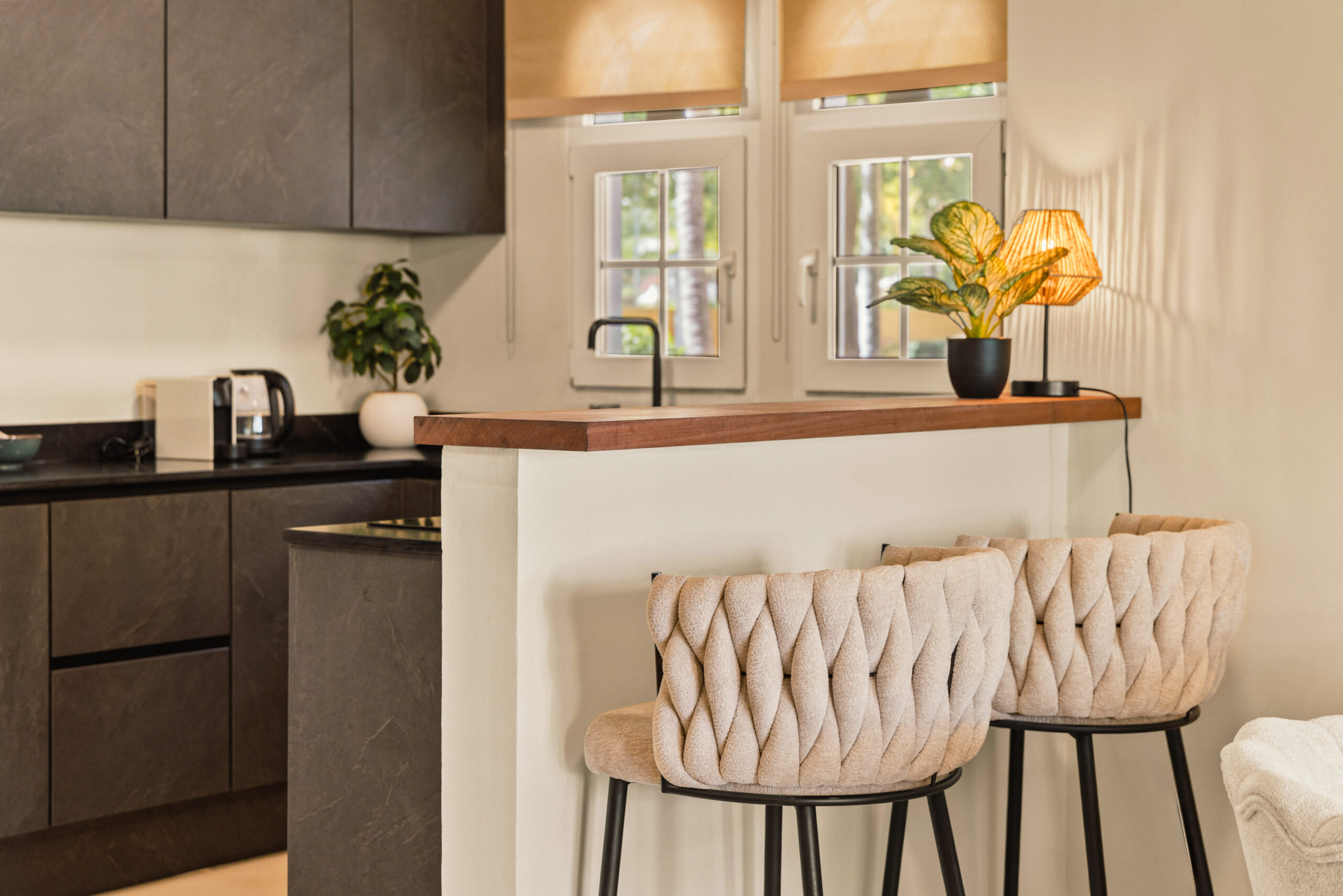 The bright and inviting living room flows seamlessly into the open kitchen and outdoor area, creating a pleasant open-plan living space where indoor and outdoor living blend effortlessly. Large windows and French doors provide plenty of natural light and allow you to enjoy a refreshing breeze from the water.